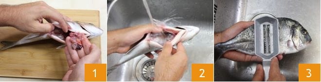Para preparar la dorada en sartén, lo primero que hay que hacer es ocuparse de la limpieza del pescado (de lo contrario, si las compráis ya evisceradas, su peso deberá rondar los 400 g cada una): practicad un corte en el vientre con las tijeras y retirad las vísceras con las manos 1, luego enjuagad cuidadosamente el interior bajo agua corriente 2 y eliminad las escamas utilizando un desescamador o la hoja de un cuchillo; realizad esta operación bajo el agua corriente o dentro de una bolsa de plástico, para no esparcir las escamas por todas partes 3. Para más detalles sobre el procedimiento, consultad nuestra escuela de cocina “Cómo limpiar la dorada”.
