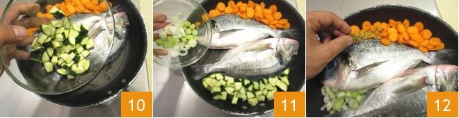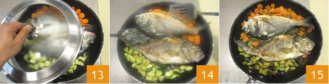 Cubrid la sartén con una tapa 13 y cocinad a fuego medio durante 7 minutos, luego dad la vuelta a las doradas con la ayuda de 2 espátulas teniendo cuidado de no romperlas 14; cubrid nuevamente con la tapa y cocinad durante otros 7 minutos 15. Los tiempos de cocción, obviamente, pueden variar según el peso de la dorada que utilicéis. ¡La dorada en sartén está lista para ser servida!