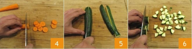 Ahora pasad al corte de las verduras: lavad y pelad las zanahorias, luego cortad los extremos y cortadlas en rodajas de aproximadamente 5 mm de grosor 4. Lavad y cortad también los extremos de los calabacines, cortadlos por la mitad a lo largo y luego dividid cada mitad nuevamente 5; finalmente cortadlos en cubos de aproximadamente 1 cm de grosor 6.
