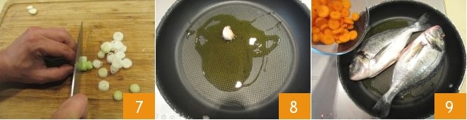 Por último, lavad la cebolleta, eliminad la base y cortadla en rodajas de aproximadamente 5 mm de grosor 7. Verted el aceite en una sartén antiadherente grande, añadid el diente de ajo con piel y dejadlo sofreír durante un par de minutos 8. Cuando el aceite esté aromatizado, retirad el ajo de la sartén y colocad las doradas en su interior, luego agregad las zanahorias 9,