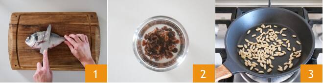 Para preparar la dorada al papillote a la siciliana, toma las doradas ya evisceradas y corta las aletas laterales 1. Luego, con unas tijeras, amplía el corte del vientre ya presente, de modo que puedas tener más espacio para el relleno. Elimina las escamas externas frotando con la hoja de un cuchillo, luego enjuaga bien bajo agua corriente. Enjuaga también las pasas y ponlas en remojo en agua fría durante al menos 10 minutos 2. Tuesta los piñones en una sartén durante 2-3 minutos, para hacerlos más aromáticos 3.