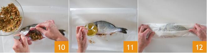 Coloca cada dorada sobre un rectángulo de papel de horno que pueda contenerla por completo. Rellénala con la mezcla aromática 10 y úntala exteriormente con un hilo de aceite 11. Sella cada pescado en el papel de horno 12,