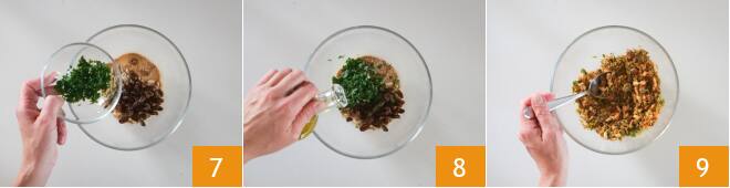 el perejil 7, una pizca de sal y de pimienta. Añade aceite en hilo, para que humedezca el pan rallado sin hacerlo excesivamente grasiento 8. Mezcla la mezcla de sabores 9.