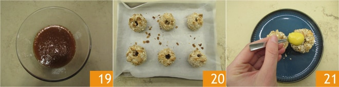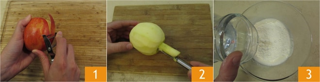 Para preparar el postre con annurcas y sabayón, pela las manzanas 1 y con un cuchillo elimina el corazón dejando un agujero en el centro 2. En un cuenco mezcla las galletas desmenuzadas con los copos de avena. En otro cuenco mezcla la harina con el agua, poco a poco 3.