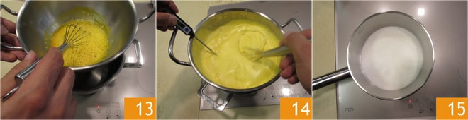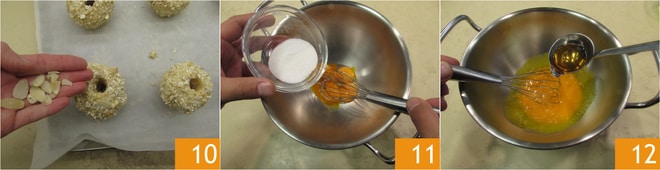 Decora la superficie con escamas de almendra 10. Hornea en horno estático a 180° durante 45-50 minutos, controlando de vez en cuando, ya que la cocción depende de lo jugosa que esté la manzana. Mientras tanto, prepara el sabayón poniendo en un cuenco los huevos y el azúcar 11, mezcla para combinar. Añade poco a poco el marsala 12.