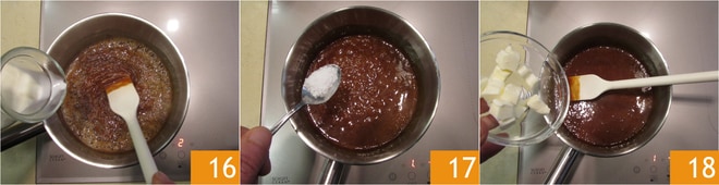 Cuando el caramelo tenga un color ámbar, añade la leche y mezcla. Apaga y continúa mezclando para espesar, añade la sal 17 y la mantequilla 18.