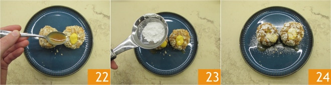 Decora con el caramelo salado 22 y una pizca de azúcar glas 23. El postre con annurcas y sabayón está listo para ser disfrutado 24.