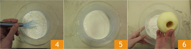Mezcla bien con la batidora 4 para crear una masa suave y sin grumos 5. Sumerge las manzanas primero en la masa de harina y agua 6.