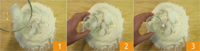 Para realizar las empanadas con gorgonzola y puerros, lo primero es preparar la masa: formad un volcán con la harina sobre la superficie de trabajo, luego añadid en el centro la manteca 1, la sal 2 y el vinagre 3.
