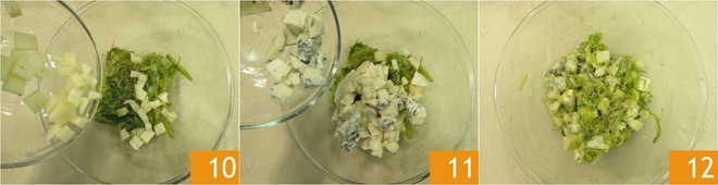 Pasad los puerros a un bol y añadid los quesos en cubitos: el Branzi 10, el gorgonzola dulce y el gorgonzola picante 11. Mezclad bien y reservad 12.