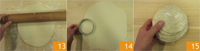 Recuperad la masa y estiradla hasta un espesor de 1,5 mm; podéis utilizar el rodillo o la máquina para pasta 13. Sacad 18 discos con un cortapastas de 12 cm de diámetro 14. Si no los utilizáis enseguida, podéis envolverlos en film y guardarlos en el frigorífico 15.
