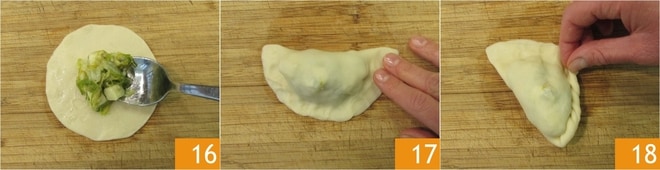 Colocad un disco de masa sobre la superficie de trabajo y añadid en el centro una cucharada de relleno 16. Doblád el disco por la mitad y presionad los bordes con los dedos para sellarlos 17, luego haced unos pliegues para crear el típico cordón 18. Como alternativa, podéis sellar el borde presionando con los dientes de un tenedor.