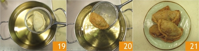 Después de formar las empanadas, calentad abundante aceite de semillas en una cacerola hasta alcanzar la temperatura de 160°. Freíd 1 o 2 piezas a la vez durante 4-5 minutos 19. Escurrid las empanadas cuando estén bien doradas 20 y pasadlas a papel absorbente para eliminar el exceso de aceite. ¡Vuestras empanadas con gorgonzola y puerros están listas para disfrutarse 21!