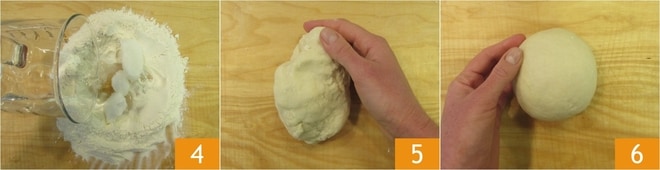 Añadid el agua tibia 4 y amasad hasta obtener una mezcla lisa y homogénea 5. Formad una bola 6 y dejad reposar la masa en el frigorífico durante 30 minutos.