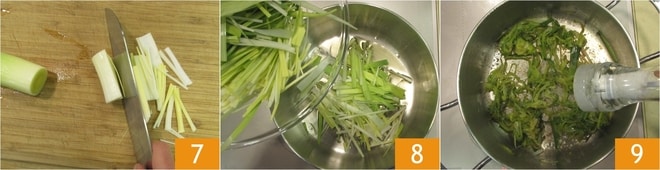 Mientras tanto podéis dedicaros al relleno: limpiad los puerros y cortadlos en juliana procurando que no sean demasiado largos 7, luego vertedlos en una sartén con el aceite caliente 8. Sofreíd los puerros a fuego medio-alto durante 6-7 minutos hasta que empiecen a dorarse; deberán reducirse de volumen aproximadamente el 50%. Sazonad al final de la cocción 9.