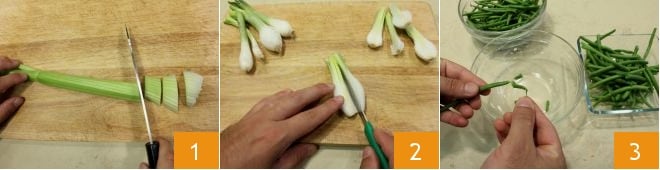 Para preparar la giardiniera en vinagre, primero lava bien todas las verduras bajo abundante agua fresca corriente y luego límpialas. Con un cuchillo, corta el apio en trozos de 1 cm de grosor 1, luego elimina las raíces de los cebollines y córtalos por la mitad 2; después limpia las judías verdes, quitando los extremos 3.