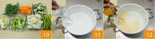 Cuando hayas terminado de limpiar y cortar todas las verduras 10, pon al fuego una olla grande con el agua 11 y el vinagre 12.