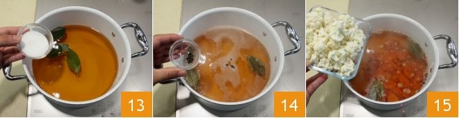 Añade las hojas de laurel, la sal, el azúcar 13 y la pimienta negra y el enebro en grano 14. Cuando el agua haya alcanzado el punto de ebullición, añade las zanahorias y la coliflor 15, hirviendo durante 3 minutos a fuego moderado.