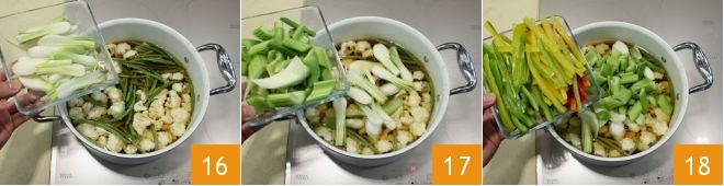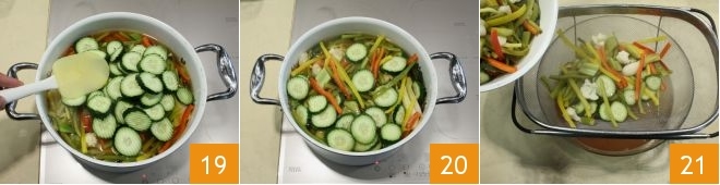 Termina con los pepinos 19 y hierve todo durante otros 4 minutos. Una vez que las verduras estén listas 20, retira la olla del fuego y escúrrelas bien, conservando el líquido de cocción en un bol 21.