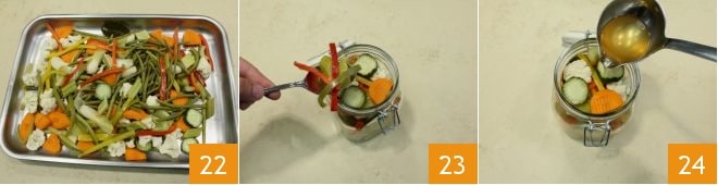 Deja enfriar las verduras en una bandeja de acero 22 y mientras tanto procede a la esterilización de los tarros y tapas como se indica en las guías del Ministerio de Salud al final de la receta. Cuando las verduras se hayan enfriado completamente, colócalas en el tarro 23 tratando de ordenarlas pero sin presionarlas demasiado. En este punto, filtra el líquido de cocción que has reservado y viértelo en los tarros, cubriendo las verduras pero deteniéndote a 1 centímetro del borde del tarro 24. Cierra los tarros. Si usas tarros con tapa de rosca, gira bien las tapas pero sin apretar demasiado. Luego pasa a la ebullición de los tarros, es decir, la pasteurización, siguiendo las indicaciones de las guías del Ministerio de Salud citadas al final de la receta. Si usas tarros con tapas de rosca, una vez que los tarros se hayan enfriado, verifica si el vacío se ha realizado correctamente: puedes presionar en el centro de la tapa y, si no escuchas el clásico "click-clack", el vacío se habrá realizado. Si después de la reebullición notas la formación de pequeñas burbujas de aire, cuando el tarro aún esté caliente, golpea suavemente sobre una superficie, para que las burbujas suban a la superficie y desaparezcan naturalmente. Si usas tarros con cierres de goma, al momento de consumir la giardiniera puedes hacer la prueba de vacío tirando de la lengüeta: si al tirar produce un sonido seco, significa que el contenido se ha conservado con el vacío correcto. Por el contrario, si al tirar de la lengüeta la goma resulta "floja", significa que no se ha creado el vacío correctamente y es mejor no consumir el contenido. ¡Tu giardiniera en vinagre está lista para ser disfrutada!