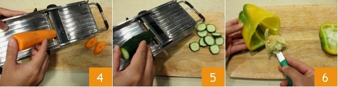 Con un pelador de patatas, pela las zanahorias y luego con una mandolina con hoja ondulada, córtalas 4 junto con los pepinos 5 en rodajas de 0,5 cm de grosor. Corta todos los pimientos y con un cuchillo quita las semillas que se encuentran en el interior 6.