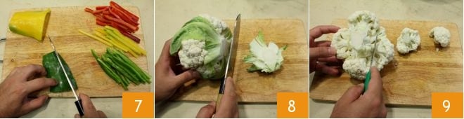 Reduce los pimientos a tiras no demasiado finas 7 y luego pasa a la coliflor. Con un cuchillo pequeño, elimina las hojas externas, corta el tronco 8, luego separa las cimas cortando donde se unen al tronco principal 9.