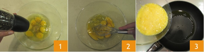 Para realizar la ensalada con huevos revueltos, primero saca los guisantes congelados del congelador y déjalos a temperatura ambiente durante al menos 15 minutos. Mientras tanto, prepara los huevos revueltos: rompe los huevos en un bol, añade sal y pimienta al gusto 1, luego bate ligeramente con un batidor de mano 2; la mezcla de yemas y claras no debe ser homogénea. Calienta un poco de aceite en una sartén y añade los huevos batidos 3.