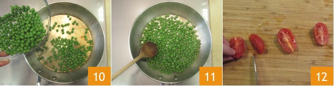 Vierte los guisantes en la misma sartén que usaste para el jamón, añadiendo si es necesario un poco más de aceite 10, y cuece durante unos minutos teniendo cuidado de no deshacerlos 11. Reserva también los guisantes y corta los tomatitos por la mitad, después de haberlos lavado previamente 12.