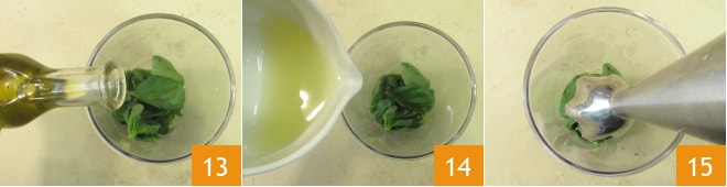 Finalmente, prepara la vinagreta de albahaca: lava y seca las hojas de albahaca, luego colócalas en un recipiente junto con el aceite 13 y el zumo de limón 14 y mezcla con una batidora de mano 15.
