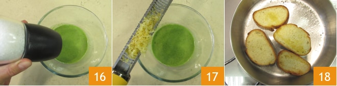 Condimenta el aderezo con sal 16 y ralladura de limón 17 y mezcla bien para amalgamar todo. Por último, tuesta las rebanadas de pan en una sartén con un poco de aceite 18.
