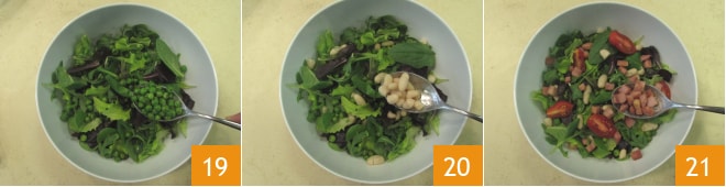 En este punto estás listo para montar tu ensalada: vierte la mezcla de lechugas en un bol grande y añade los guisantes 19, las alubias cannellini 20, los tomatitos y el jamón cocido 21.