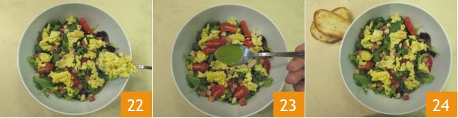 Añade también los huevos revueltos 22 y condimenta con la vinagreta de albahaca 23: ¡tu ensalada con huevos revueltos está lista para servirse acompañada de las rebanadas de pan tostado 24!