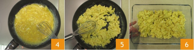 Cuece durante un par de minutos a fuego medio-alto hasta que los huevos comiencen a cuajar, luego rómpelos con el batidor, una espátula o un tenedor para obtener el efecto revuelto 4. Los huevos deben quedar todavía suaves pero no secos 5. Retira la sartén del fuego, transfiere los huevos revueltos a un recipiente y reserva 6.