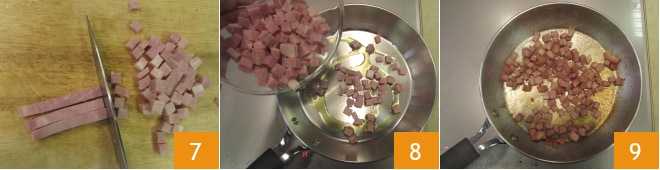 Corta el jamón cocido en cubos 7 y dóralos en la sartén con un poco de aceite durante unos minutos 8. Cuando estén dorados 9, transfiere los cubos a un bol y reserva.