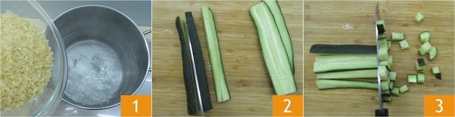 Para realizar la ensalada de arroz a la griega, primero lleva a ebullición una olla de agua, luego añade sal y cocina el arroz durante 10 minutos 1. Mientras tanto, prepara el condimento: lava los pepinos y córtalos primero en rodajas 2 y luego en cubos 3.
