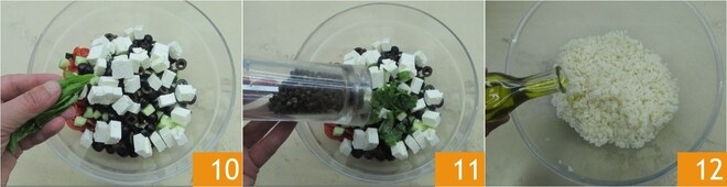 Desmenuza las hojas de albahaca con las manos 10 y condimenta con sal, pimienta 11 y un chorrito de aceite. Pasado el tiempo de cocción, escurre el arroz y transfiérelo a otro bol. Condimenta con un chorrito de aceite 12 y mezcla, luego deja enfriar.