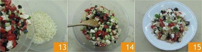 Cuando el arroz se haya enfriado, añade el condimento 13 y mezcla bien todo 14. ¡Tu ensalada de arroz a la griega está lista para ser disfrutada 15!