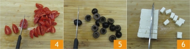 Lava los tomatitos y córtalos en 4 partes 4, luego divide las aceitunas por la mitad 5. Finalmente, corta el queso feta en cubos 6.