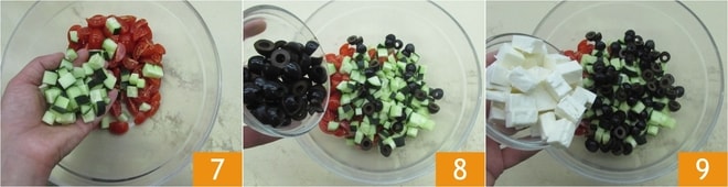 Vierte los tomatitos en un bol junto con los pepinos 7, las aceitunas 8 y el queso feta 9.