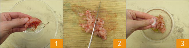 Para preparar la ensalada con cítricos, espinacas y gambas, comienza limpiando las gambas: separa la cabeza, el caparazón 1 y extrae el intestino. En una tabla de cortar, corta en trozos pequeños para hacer un tartar 2. Vierte el tartar de gambas en un bol y sazona con 50 g de aceite y una pizca de sal 3.