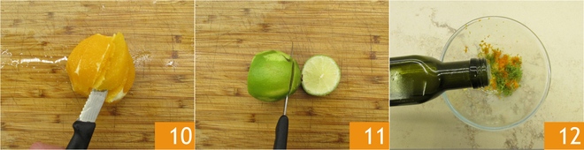 Haz lo mismo con la naranja 10 y la lima 11. Vierte en el bol de las cáscaras 50 g de aceite de oliva virgen extra 12.