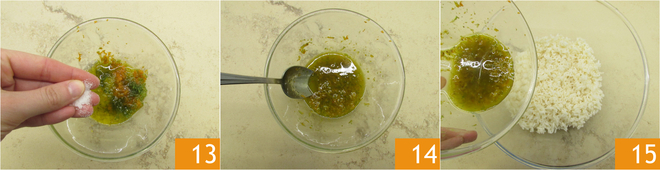 Sazona con una pizca de sal 13 y un poco de pimienta rosa, mezcla bien 14 y aliña el arroz 15.