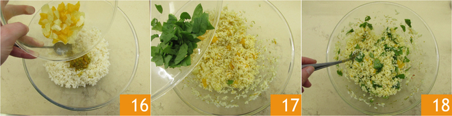 Añade también la pulpa de los cítricos 16 y las espinacas que habrás roto previamente con las manos de manera gruesa 17. Mezcla para amalgamar 18.