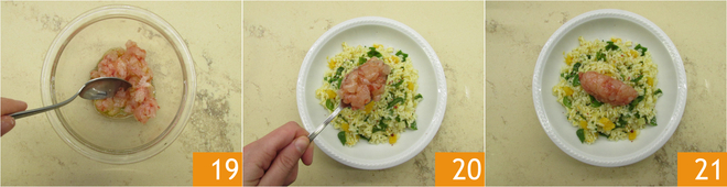 Mezcla 19 y emplata el arroz, colocando encima una quenelle de gambas 20 y finalmente adorna con los cacahuetes tostados y triturados 21.