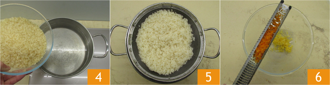 Mientras tanto, encárgate del arroz, hiérvelo 4 durante el tiempo indicado en el paquete en agua hirviendo y con sal. Una vez listo, escúrrelo 5 y resérvalo. Ralla la cáscara del limón y la naranja 6.