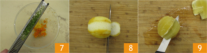 Ralla también la cáscara de la lima 7 y sazona con la pimienta rosa. Luego con un cuchillo pela el limón al vivo 8 9 y córtalo en dados.