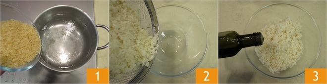 Para preparar la ensalada de arroz con macedonia de frutas, lo primero que hay que hacer es cocer el arroz en agua hirviendo, salada al gusto 1, durante unos 10 minutos. Pasado el tiempo de cocción, escurrid el arroz y enfriadlo bajo agua fría. Trasladad el arroz a un bol 2, sazonadlo con un poco de aceite 3 y dejadlo enfriar.