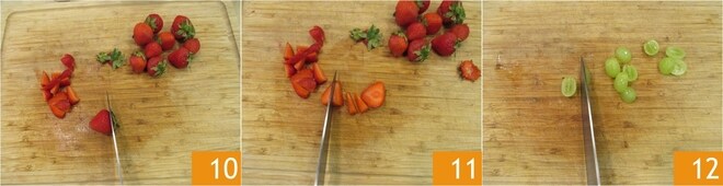 Encargaos de las fresas, lavadlas bien y eliminad el pedúnculo 10. Cortadlas en gajos pequeños 11, o si son muy grandes, en cubos. Lavád bien también las uvas y cortad los granos por la mitad 12.