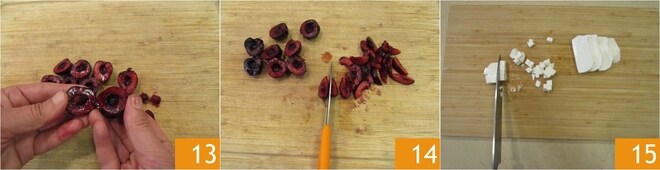Lavad bien las cerezas, deshuesadlas dividiéndolas por la mitad 13 y cortadlas en gajos 14. Cortad también el primosale en cubos de medio cm 15.