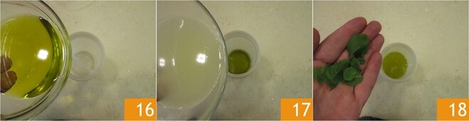 Preparad la citronette. Dentro de un biberón de cocina, o en un tarro de vidrio, verted el aceite 16, el jugo de limón 17 y las hojas de menta 18.